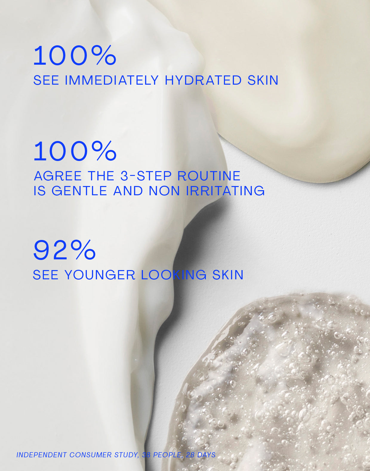 Deeply hydrate skin in 3 simple steps in under 3 minutes daily for beautifully radiant and youthful-looking skin. Most traditional 3-step routines strip the skin in the first two steps with a cleanser and toner, leaving all the moisturizing muscle to the cream. The Outset hydrates at every step, with our signature Hyaluroset™ botanical hydrator that outperforms hyaluronic acid in 24-hour moisturization tests and repairs the skin barrier in 2 weeks.